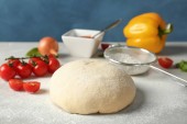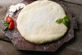 Świeże ciasta przygotowane pomidory i pieczarki pokrojone w plastry na drewnianej desce, z bliska