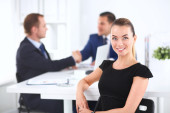 Biznesmeni siedzący i dyskutujący na spotkaniu biznesowym, w biurze