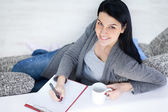 młoda kobieta siedzi na kanapie i za pomocą laptopa