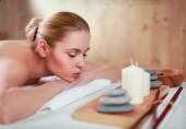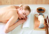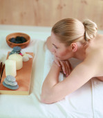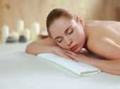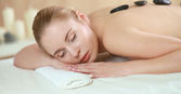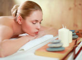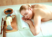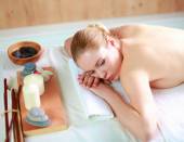 Piękna młoda kobieta dostaje masaż spa, leżąc na salonie