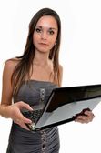 kobieta z laptopem w rękach na białym tle