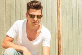 artist pose seated looking away while resting hand on guitar