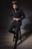 guy posing seated on stool looking away, in dark studio