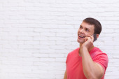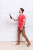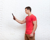 Człowiek ręką gest wobec kopiować miejsca komórka telefon