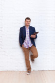 Młody biznesmen za pomocą telefonów Smartphone społecznych sieci komunikacyjnej