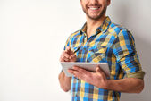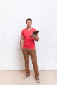 Człowiek przy użyciu komputera typu Tablet zajęty, chodzenie na ścianie