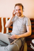 Młody człowiek, słuchanie muzyki na laptopie