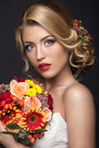 Portret piękna modelka z bukiet lilii w ręce, słodki i zmysłowy. Uroda makijaż, włosy.
