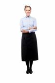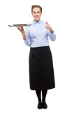 Kelnerka Trzymając zasobnik na białym tle nad białym tle. Uśmiechając się. W