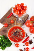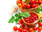 Miska z sosem pomidorowym i pomidorkami na drewnianym stole.