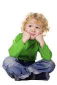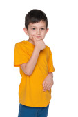 Uśmiechający się mały chłopiec w pasiastej koszuli spogląda