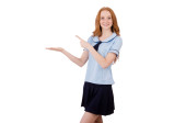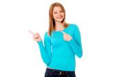 Zdjęcie "Uśmiechnięta młoda kobieta wskazując na bok." może być wykorzystywane do celów osobistych i komercyjnych zgodnie z warunkami zakupionej licencji Royalty-free. Obraz jest dostępny do pobrania w jakości wysokiej rozdzielczości do 5760x3840.