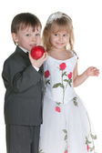 uśmiechnięty chłopiec i ładna dziewczyna z kwiatami
