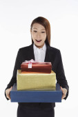 Uśmiech biznes kobieta otwiera pudełko za biurkiem