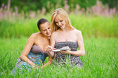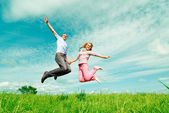 dwie młode dziewczyny piękne podskakuje na lato zielony park