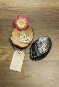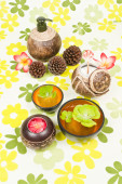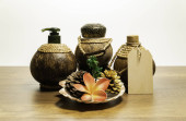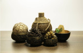 Dwie miski mosiądzu i drewna złota na liściu banan brązowy