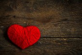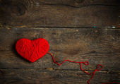 Czerwone serce kształt wykonane z wełny na stary brudny drewniane tła