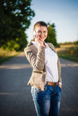 Młody piękny szczęśliwy biznes kobieta w zielonej koszuli na zewnątrz