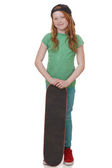 moda bardzo mała dziewczynka z deskorolka, na białym tle