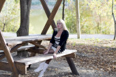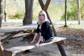 piękna blondynka w białych butów siedzi na ławeczce, drewniane