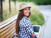młoda kobieta elegancka sobie Słomkowy kapelusz i białej sukni z noteboo