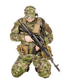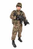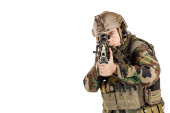 wojskowych, zawód, ludzi i wojny koncepcja - żołnierz w kamuflażu z karabinem na białej ścianie