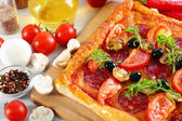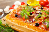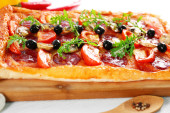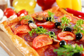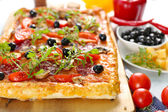 Prostokąt pyszną pizzę na stole, szczelnie-do góry