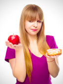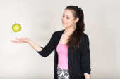 Zdrowa młoda kobieta ubrana w różowej koszuli rzucanie się zielone jabłko