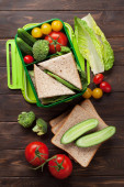 Concept diet food. Breakfast of arugula, young carrots and cucumber. Near oatmeal useful bread and a glass of water.