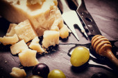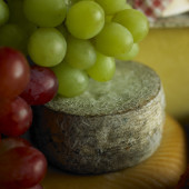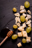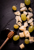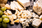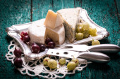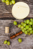 Kompozycja serów, jagody, butelki i kieliszków wina na drewnianym stołem