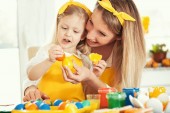 uśmiechnięta kobieta wyświetlone taca z kolorowych pisanek