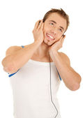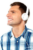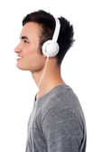 dorywczo młody człowiek słuchania muzyki w słuchawkach