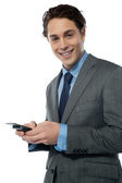 spokojny młody uśmiechnięty mężczyzna słuchanie muzyki