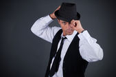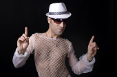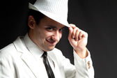 uśmiechnięty człowiek z jego biały kapelusz i płaszcz, na czarnym tle. łapka