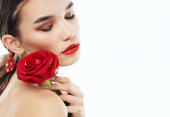 piękna dziewczyna w białej sukni z kwiatkiem w ręku