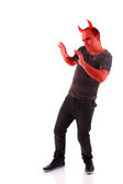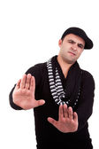 portret młodego człowieka poważnego, w jesienne i zimowe ubrania, na białym tle. łapka
