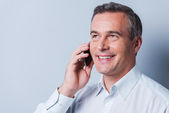 siedząc przy biurku w telefonie, na białym tle uśmiechnięty mężczyzna w średnim wieku. łapka