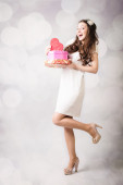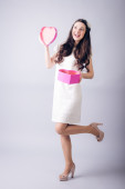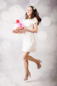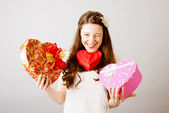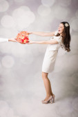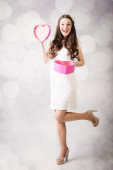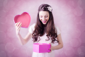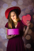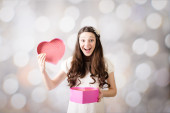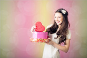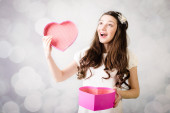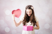 Piękna panienka patrząc na pudełko serce na tle bokeh