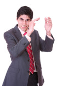 młody biznesmen z ręki jako oficer policji z broni podniósł, na białym tle na biały, łapka