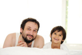 Zdjęcie "Szczęśliwy blondynka młoda matka z synem w łóżku" może być wykorzystywane do celów osobistych i komercyjnych zgodnie z warunkami zakupionej licencji Royalty-free. Obraz jest dostępny do pobrania w jakości wysokiej rozdzielczości do 5760x3840.