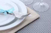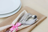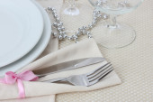 Nakrycie stołu widelcem, nożem, talerzami i serwetką