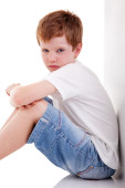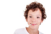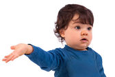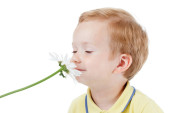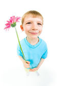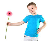 ładny chłopak oferuje kwiaty, na białym tle. łapka
