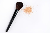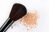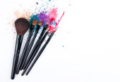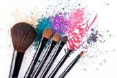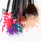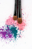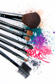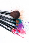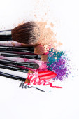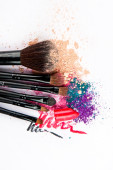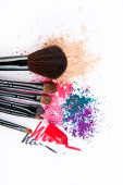 Makijaż szczotki na białym tle z kolorowy proszek. Makijaż