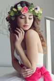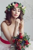 Nowoczesny i stylowy panny młodej w kwiatowy wianek na głowie i z