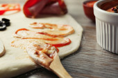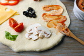 Świeże składniki na pizzę przygotowujemy na drewnianym stole, z bliska