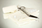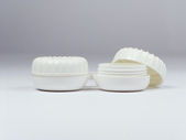 soczewki kontaktowe w pojemnikach i pincety na niebieskim tle