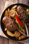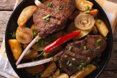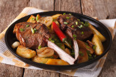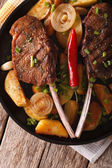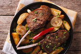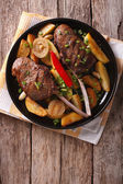 Stek wołowy z chili i przystawka ziemniaków z bliska. Vert