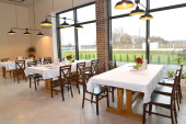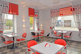 Sytuacja w nowoczesną kawiarnię z czerwone krzesła. Wnętrze
