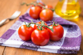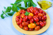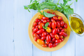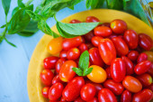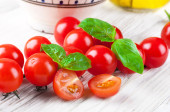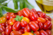 Wiśniowe pomidory z bazylią, oliwy z oliwek i makaron.