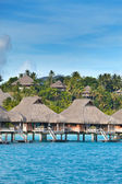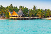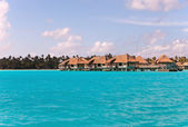 Domy nad wody przejrzyste spokojne morze i palmy. Malediwy